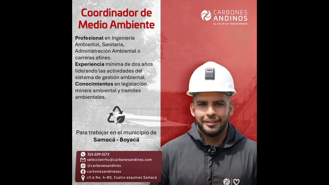 Empresa del sector minero energético ubicada en Samacá busca Coordinador(a) de Medio Ambiente, profesional en Ingeniería Ambiental, Ingeniería Sanitaria, administración ambiental. Experiencia mínima de dos (02) años relacionada al cargo.
